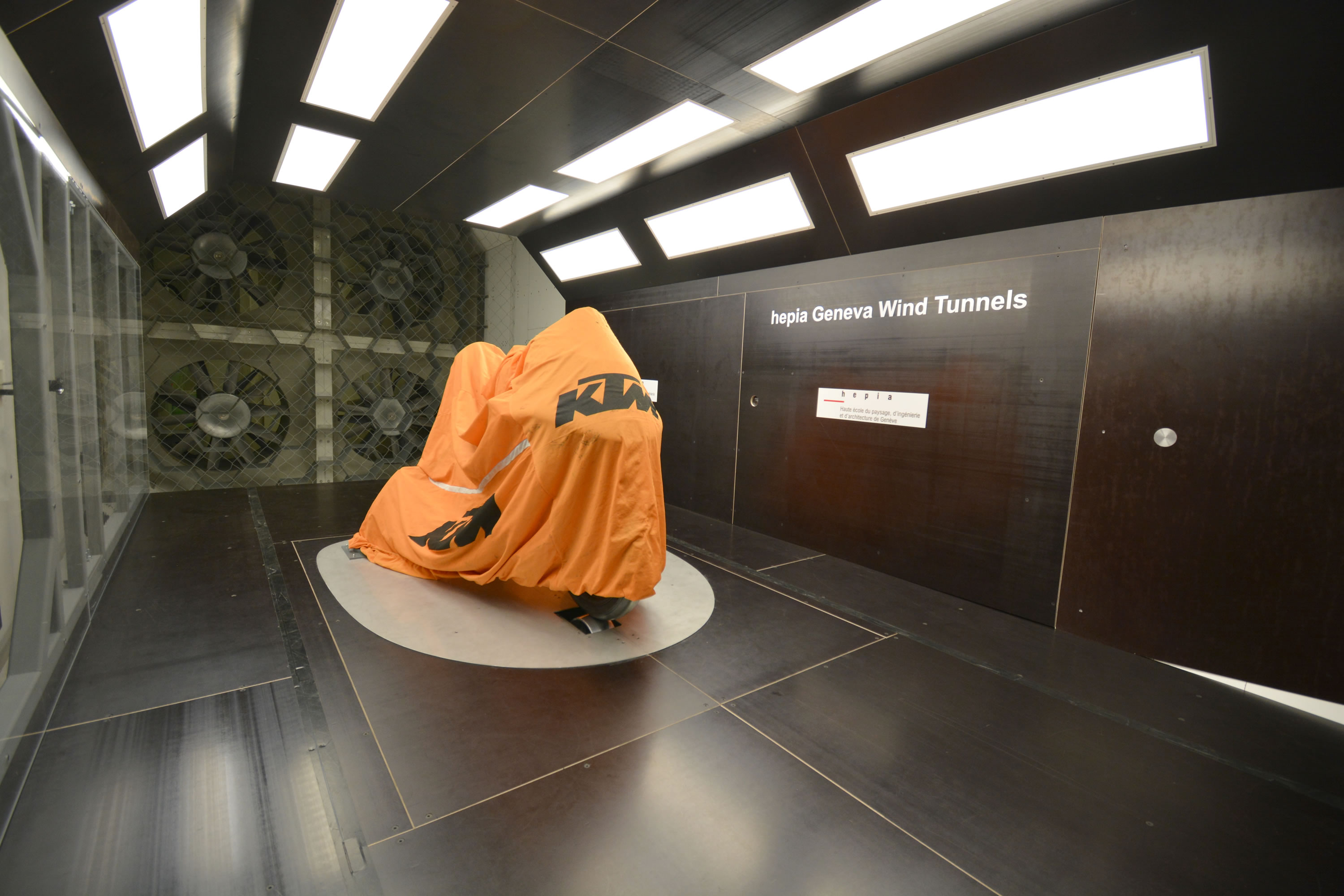 La Haute École du Paysage, d’Ingénierie et d’Architecture de Genève (HEPIA) a signé un accord historique avec le constructeur autrichien de motos KTM pour l’étude de l’aérodynamique des motos de courses inscrites au championnat du monde MotoGP. HEPIA a développé une nouvelle section d’essais plus grande et plus instrumentée, permettant de réaliser des essais aérodynamiques sur des motos dans différentes configurations de déplacement. Le système permet d’évaluer notamment l’aérodynamique des motos en courbes.
